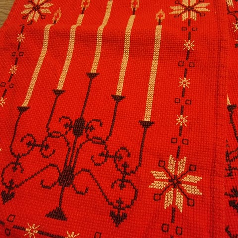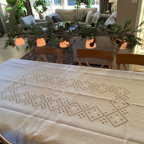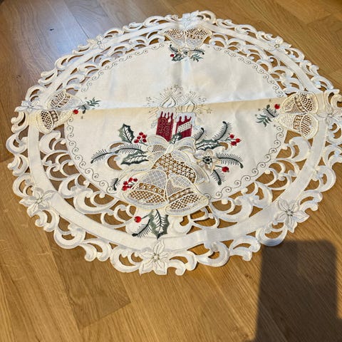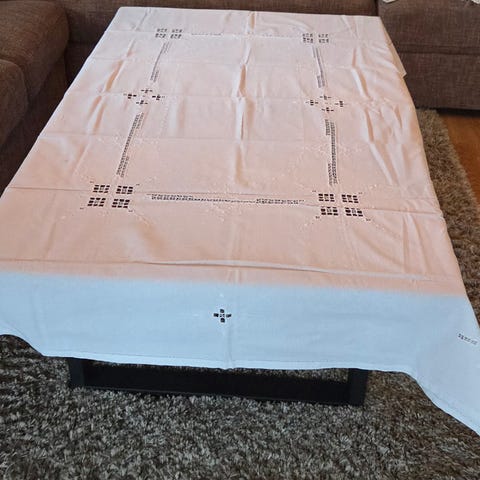 Selger med tungt hjerte min Hardangerduk 130 x 190 cm. Den blei gitt meg i gave, men aldri hatt hjerte til å bruke den.