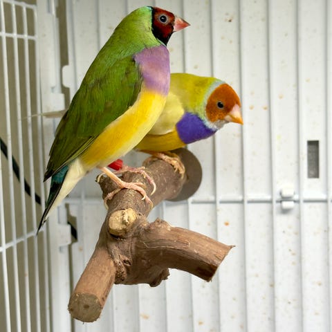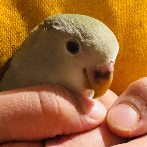 Voiler fugler men han blå spiser hirse fra hånden innimellom.