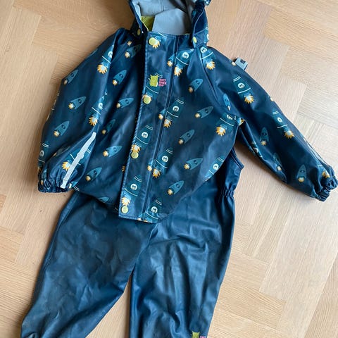 Kattnakken plask regnsett i str 98. Har hele fotstrikker og kan ikke finne noe slitasje i stoffet.