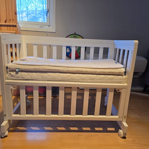 Troll bedside crib i hvit farge. Fint å kunne ha baby trygg og komfortabel rett ved siden av voksensengen. Madrassen er bare brukt en håndfull ganger da vi stort sett samsov i min seng, og kan følge med om ønskelig.