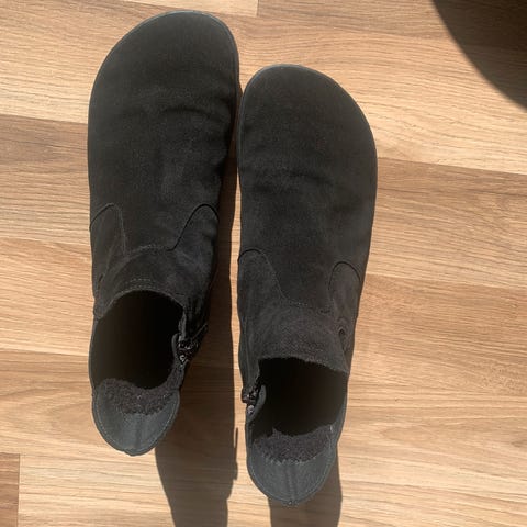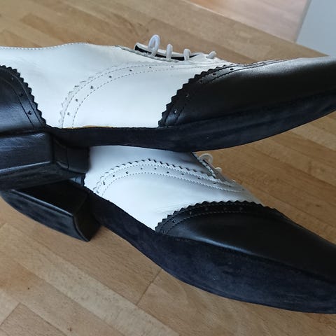 Kjempeflotte helt sorte kvalitetssko i mykt lær og hel, jevn gummisåle med rotasjonspunkt. Brukt en kort kveld. Er størrelse 44, men anbefaler til str. 42. Er litt smale, men skal sitte tett på foten, da de vil vide seg ut i bruk. Pløse og snøring.