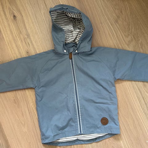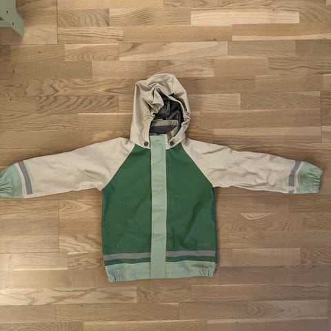 Reflex regnjakke i størrelse 128, designet for unisex bruk. Jakken har hette og knapper i front, samt reflekser for økt synlighet. Godt brukt, men mye bruk igjen.