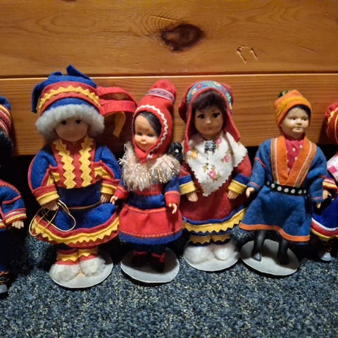 Dukkene med bibelhistoriene på ryggen er ca 16 cm høye. Det er historiene om Josef, Rut, Noah og Sakkeus. De selges samlet for kr. 200.