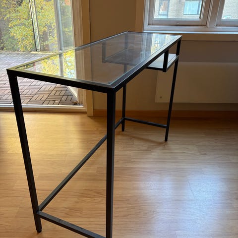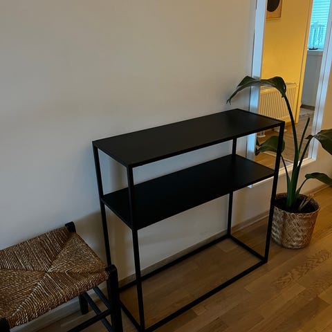Selger et konsollbord i metall for en billig penge. Det er blitt brukt til oppbevaring av sko og plantepotter, derfor noen merker. Nederste plate kan fjernes. Alt av skruer og bruksanvisning følger med.
