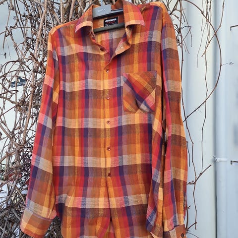 Hjemme strikket ull genser. Varme farger. Str. L.