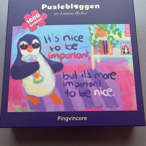 Pingvincore puslespill 1000 brikker, utarbeidet av Linnea Myhre. Puslet en gang, fremstår som helt nytt.