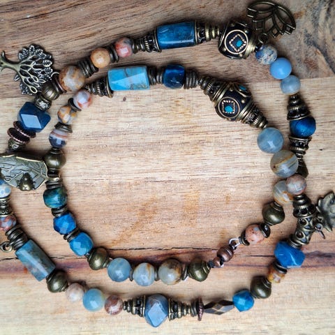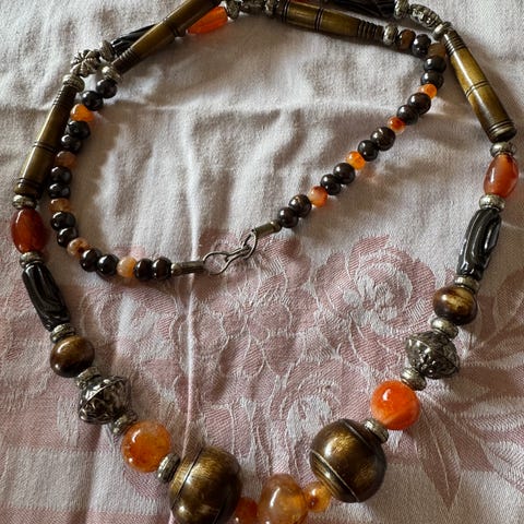 Det består av; halvedelstener, ferskvannsperler, håndlagde keramikk perler og kobber. Kjedet er 120cm langt.