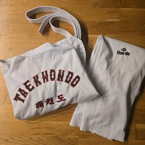 Taekwondodrakter i str 120 og 130. 100 kr per drakt. Beskyttelse for arm og legger og hode. 50 kr per del