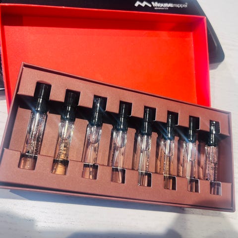 Discovery set fra BORNTOSTANDOUT. 8 prøver, som i utgangspunktet var 2 ml, er ca halvparten igjen i dem.