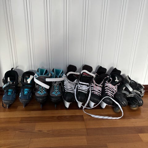 En del synlig slitasje. Men klar for mange nye dager på skøytebanen Justerbar str fra 32 til 35 Må hentes på Fjellhamar. Har en del annet utstyr også. Se egne annonser.