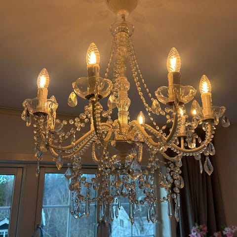 Veldig pent lysekrone chandelier i glass hvit farge. Det er ubrukt helt ny som var kjøpt fra HOMEQ for 2 år siden. Den har 5 hoved arm og 5 små arm.