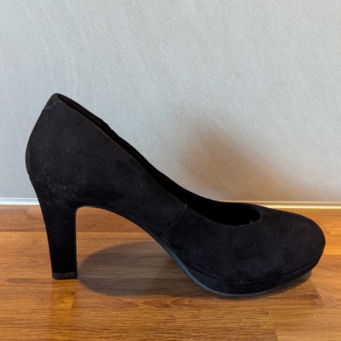 Stilige pensko fra Marco Tozzi selges for kr 200,- Kun brukt noen få ganger, litt små i str. Som nye, bortsett fra et lite merke på den ene hælen (se bilde). 8 cm høye.