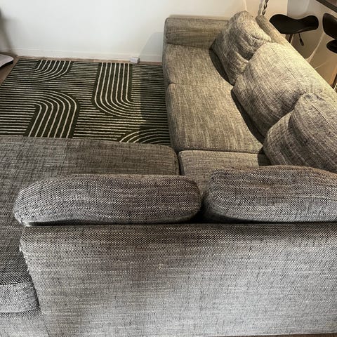 Billig grei sofa. Noen kloremerker på ene siden etter katt samt på en pute. Må hentes