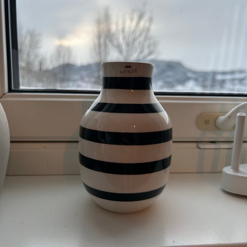 Kähler vase med dekorative rosa striper. Ca 30 cm høy. Laget i keramisk materiale med en klassisk form. Egnet for bruk som dekorasjon i hjemmet.