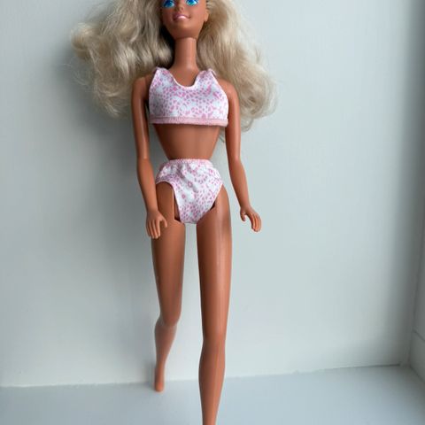Barbiedukke med lang rosa kjole. Kjolen har halterneck-design.