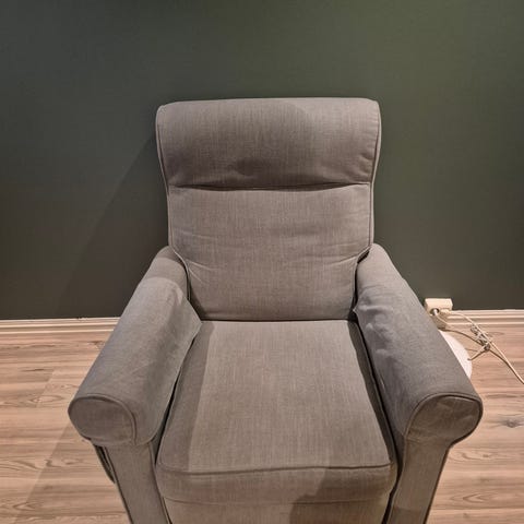 Grei sofa til salgs, stått inne på et rom nesten ikke brukt