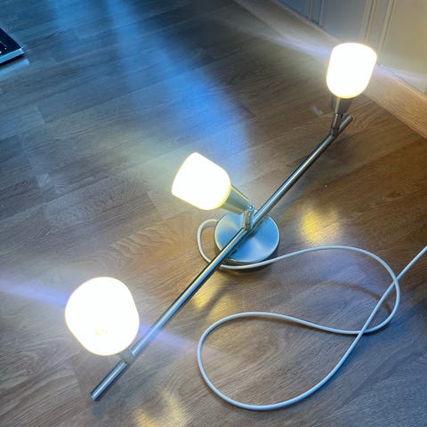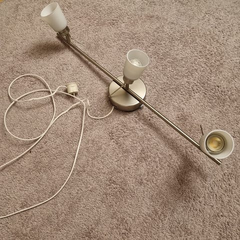 IKEA taklampe. Ca 10 år. Aldri flyttet siden den var ny. Fremstår derfor som ny. Farge: Krom/sølv. Gis bort med tre nye pærer mot henting.