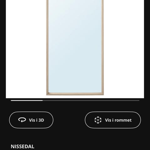 IKEA NISSEDAL speil eik farget. Speilet har en rektangulær form og er designet for oppheng på vegg. Plastikken runt er til beskyttelse og klar for transport. 40x150cm