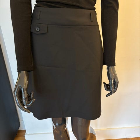Theory ull skjørt i mørk grå farge, størrelse S (amerikansk 6). Jeg har sydd hemper i for oppheng, kan lett fjernes.