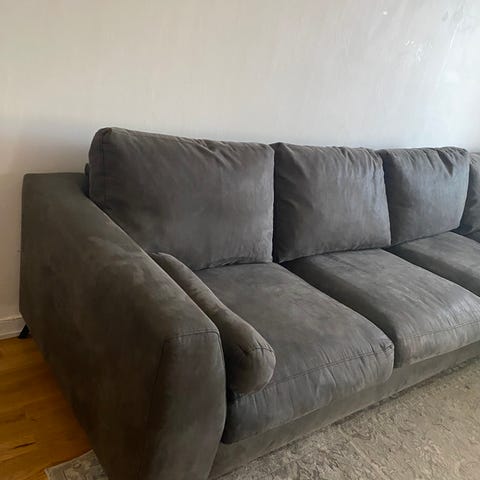 Hjørnesofa med tilhørende puff, trukket i grått stoff. Sofaen har rette armlener og ben i mørkt tre. Lengde 285 x 217