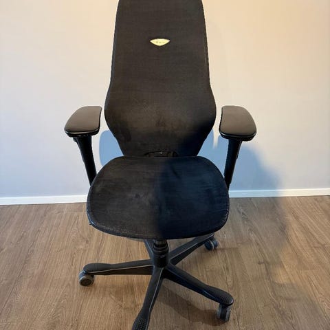Armlenene, spesielt det det ene er skinnet revnet og geleen sklidd litt. Ser stygt ut, men kan fint brukes som det er, kunkosmetisk. Kinnarps selger reservedeler hvis man vil bytte.