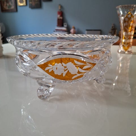 Retro (eller antikk?) glassbolle / fat med et etset blomstermønster selges for 80 kr.