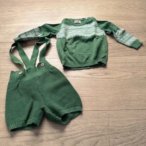 MeMini barneklær sett i størrelse 86, unisex. Settet består av en genser og shorts i gul farge. Laget av 100 % bomull. Produktet er designet med mønsterdetaljer og laget for barn.