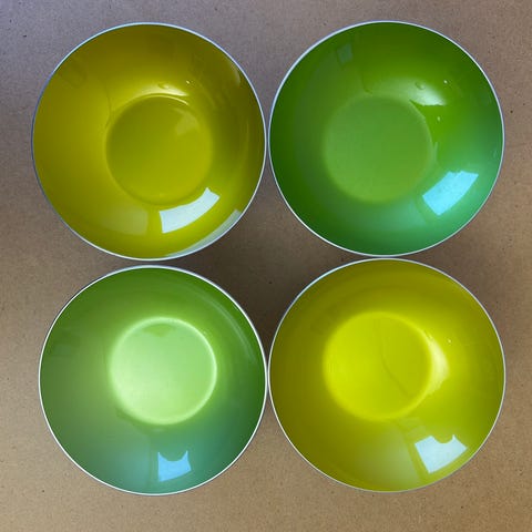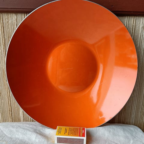 2 stk små fat (askebeger) fra Emalox Norway. Sennepsgule. Kan hentes på Hasle. Kjøper betaler evt porto