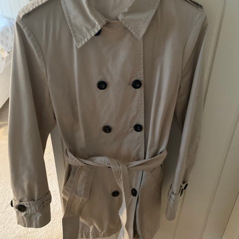 Pent brukt, lang dunjakke fra Gant i str. S, farge mørkeblå. Jakken måler ca. 80 cm, målt fra skulder og ned. Kan brukes både med, og uten belte i livet, se bilder.