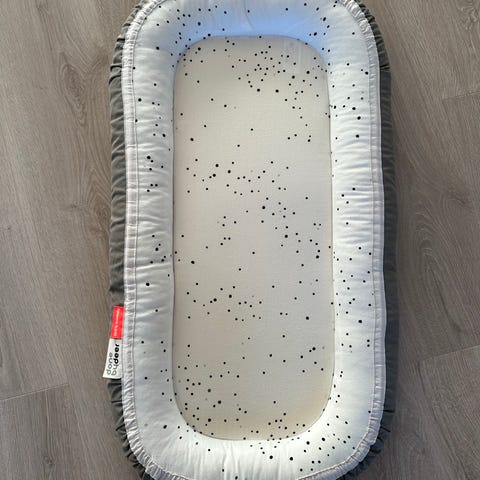 JLY Bedside crib i grått og hvitt. Designet for å plasseres ved siden av foreldreseng, gir enkel tilgang til barnet. Laget med myke materialer og netting for ventilasjon og sikkerhet. Selges da den ikke er i bruk mere