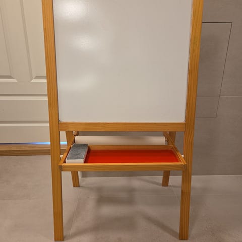 KidKraft Staffeli Wooden Easel Hvit selges. Har bruksmerker og malingsflekker, men masse bruk igjen. Praktisk forvaring under og hylle på hver side. Mangler en av koppene til vann.