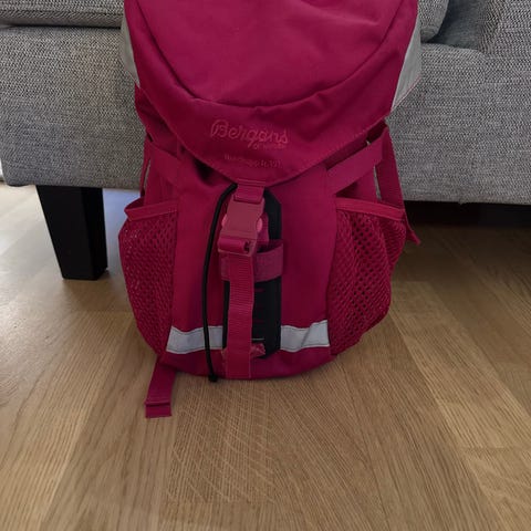 med justerbare stropper og flere lommer, inkludert nettinglommer på sidene. Sekken har klaff med spenne og snøring for lukking. Egnet for daglig bruk i barnehage og utendørsaktiviteter.