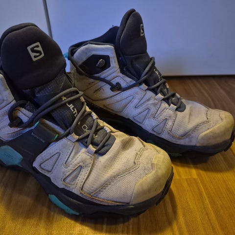 Salomon fottursko i størrelse 38 med svart farge. Passer for fottur og utendørsaktiviteter. Skoene har mønstret yttersåle for godt grep på variert underlag.