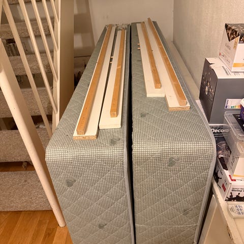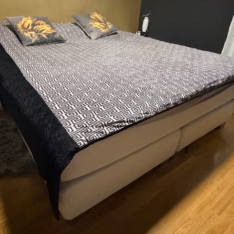 Sengen selges med bra Jensen overmadrass. Sengen er ren, uten flekker eller mangler. Den er i lys beige farge, som ser veldig luksuriøs ut i virkeligheten. Stoffet er i ull.