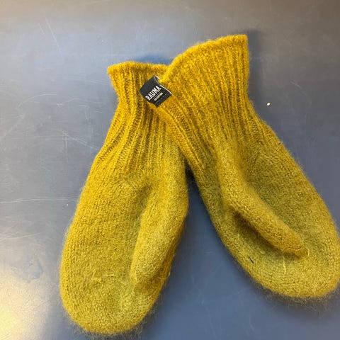2: Herrevotter, arctic fritidsgarn lett tovet, blå med grønn tommel, 125 kr