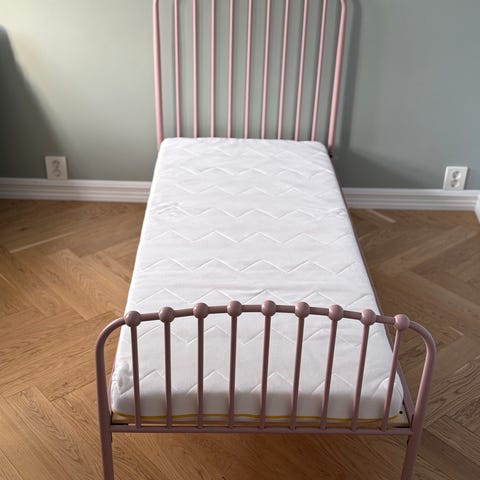 Gul seng fra hoppekids med sengehest og to skuffer. Madrass med følges dersom ønskelig. Madrassen har ingen synlige merker.