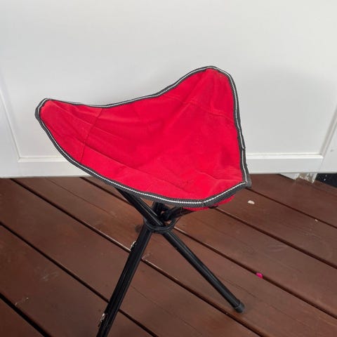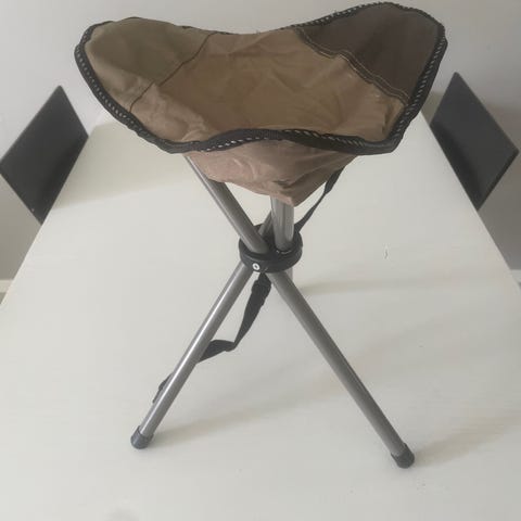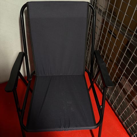 Sammenleggbar stol i grå farge med armlener og koppholder. Laget med stoffmateriale og metallramme. Passer til utendørs bruk og enkel transport.