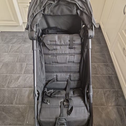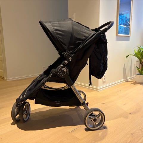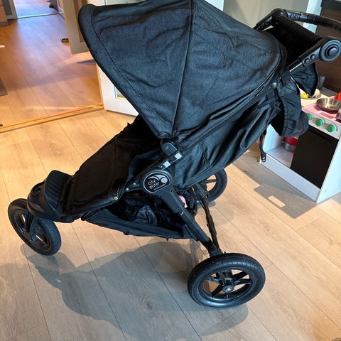 Baby Jogger City Elite trille vogn i svart farge. Trillen har tre hjul, justerbart håndtak, og solskjerm. Setet har sikkerhetssele og avtagbar frontbøyle. Har fungert helt supert. Enkel å pakke sammen og tar ikke mye plass på tur. Veldig gode hjul og passer godt på både grus, lett offroad og asvalt.