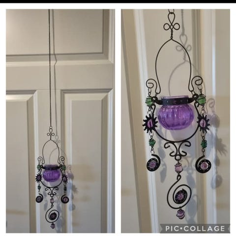 Ønsker du å live opp plantene dine med denne fine bohemske pottehengeren i lilla, blått og rosa? Selve potten er av glass, samt noen av pyntekulene.