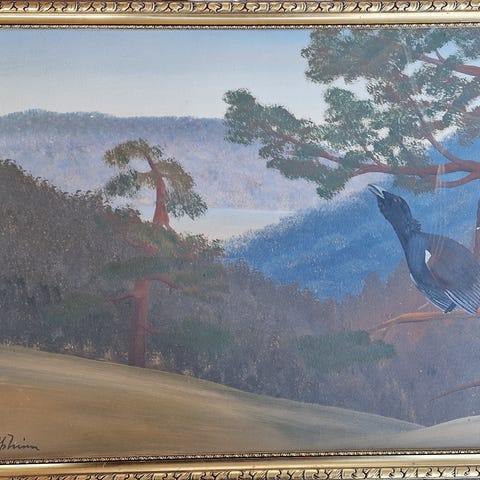 Signert maleri med motiv av et landskap som inkluderer en kornåker og bygninger. Maleriet er innrammet i en dekorativ ramme. Signaturen på maleriet indikerer kunstnerens navn. Jørg Bille ( dansk maler)