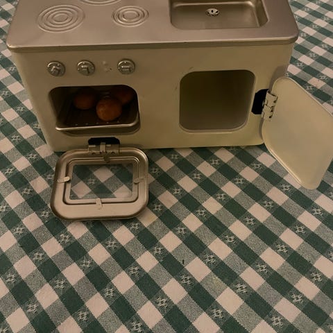 Selger IKEA lekekjøkken med kjøkkenutstyr og matvarer.