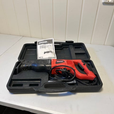 Black & Decker RS1050E bajonettsag med 1050 watt effekt og 305 mm sagbladlengde. Elektrisk sag med variabel hastighet på 0-2400 slag per minutt, egnet for ulike sagoppgaver. Leveres med oppbevaringskoffert.