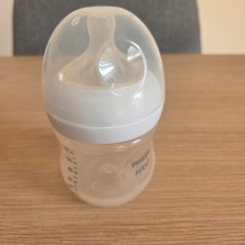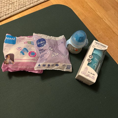 Gis bort! Baby flasker med ulike tuter og en hvit smekke fra Twistshake. Flaskene har varierende størrelser og tuttyper, egnet for babyer.