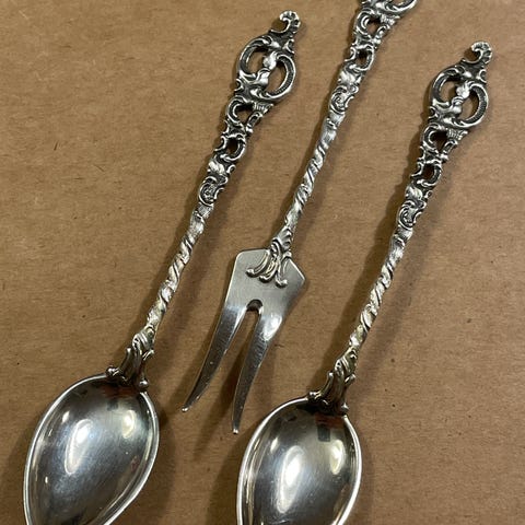 3 sølvgafler i det sjeldne og gamle mønsteret Rokokko fra David Andersen. Produsert fra 1894. Selger disse for kr 3000 samlet. (Ser de er priset til 1800/stk på bruktmarkedet)