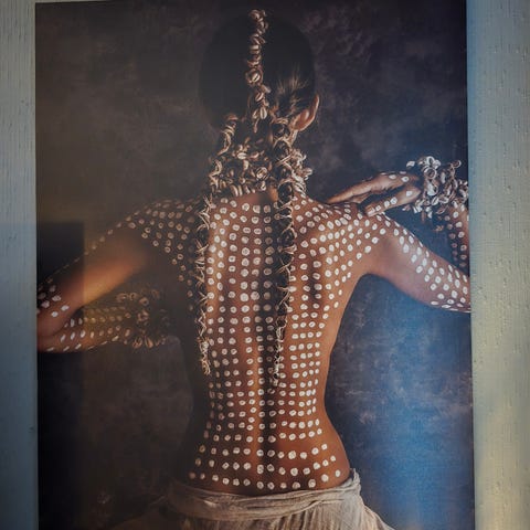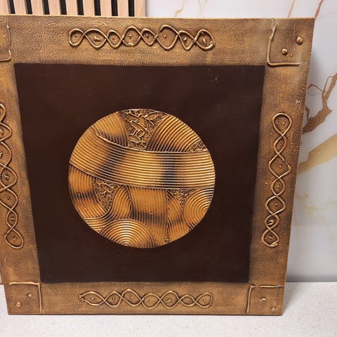 Skeidar dekorasjonstavle med rund, mønstret design i fargene gull og grå, petrol og grønn. Tavlen har en firkantet form med svart ramme på baksiden. Passer til innendørs bruk som veggdekorasjon.