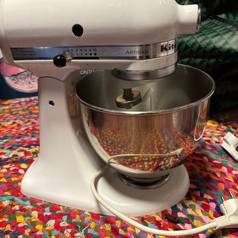 KitchenAid 5K45SSEWH kjøkkenmaskin i hvit farge. Inkluderer bolle i rustfritt stål og tilbehør som visp, deigkrok og flat visp. Egnet for blanding, elting og visping av ingredienser ved matlaging og baking.