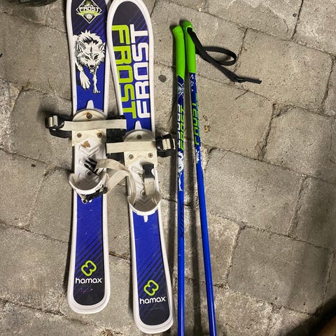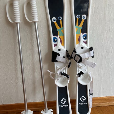 Mine første ski med stropper og staver. Perfekt til den første turen på ski. Brukes med vanlige vintersko.