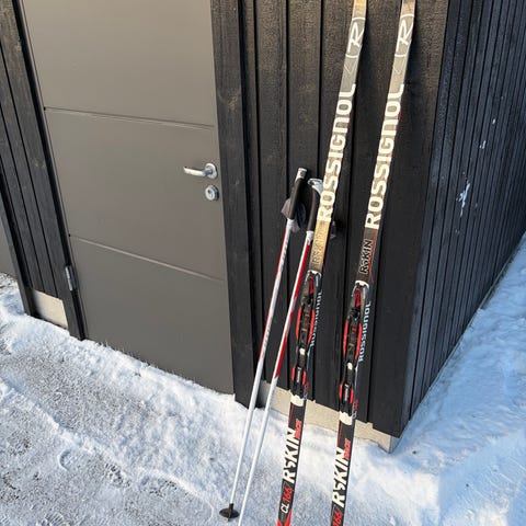 Skiene har noen bruksmerker, men fortsatt mye ski igjen. Stavene er 115cm.