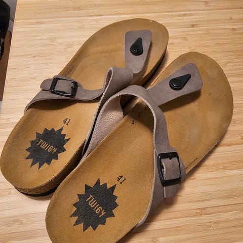 Sandaler i lær med kork såle. Kjøpt i Portugal. Nesten ikke brukt, som nye.