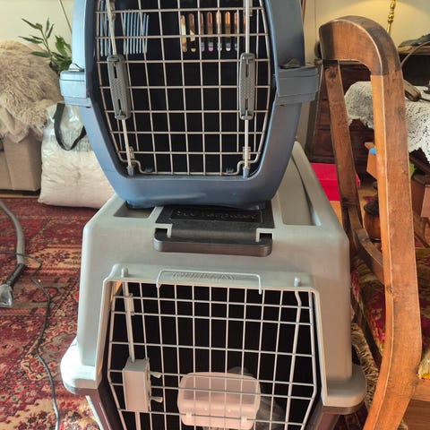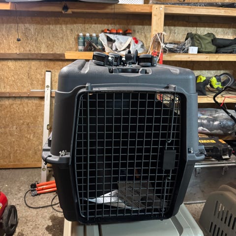 Flybur til middels stor hund. Har blitt brukt av schæfertispe på 35kg. Anbefaler ikke større hunder. Låses sammen med små bolter eller strips.